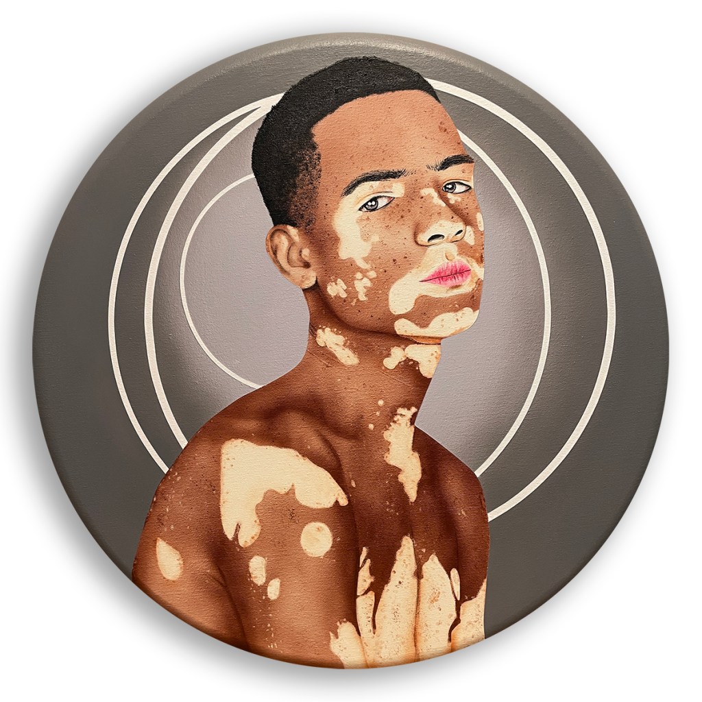“Beauty Marks,” 2021, acrylic on canvas, 24″ tondo