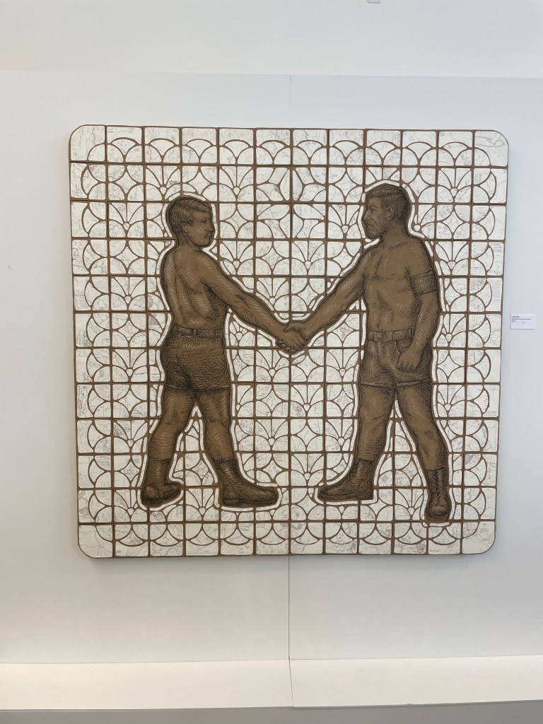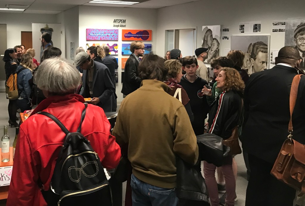 The artwork of the exhibit was divided into several sectors. The reception room included artwork reflecting icons of the LGBTQ community such as Harvey Milk and Gertrude Stein. The open conference area was devoted to painting, installations, and a corner of photographic portraits. One room focused on a mix of drawing and painted pieces and another on photographic based artwork.