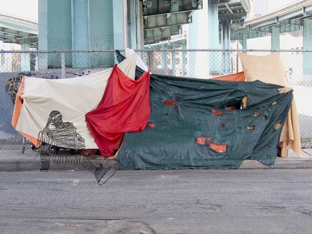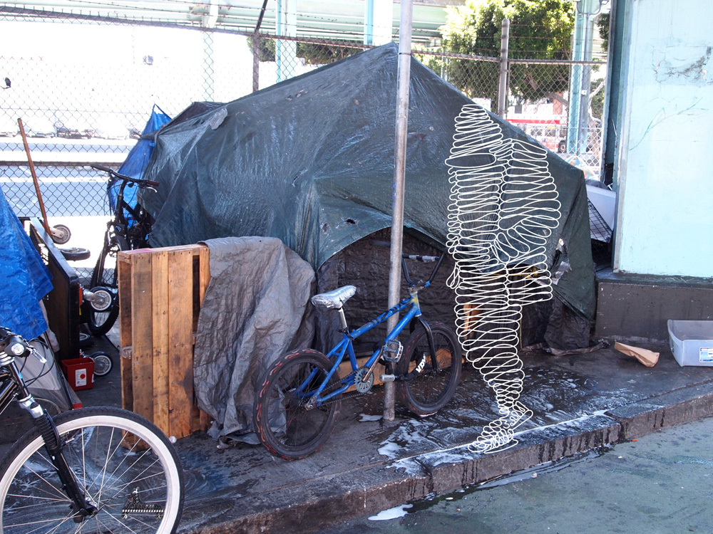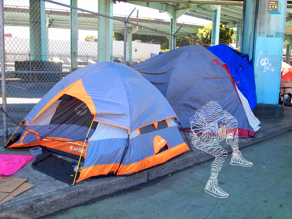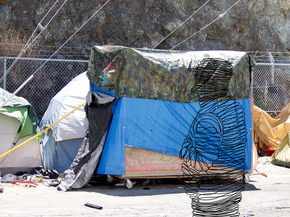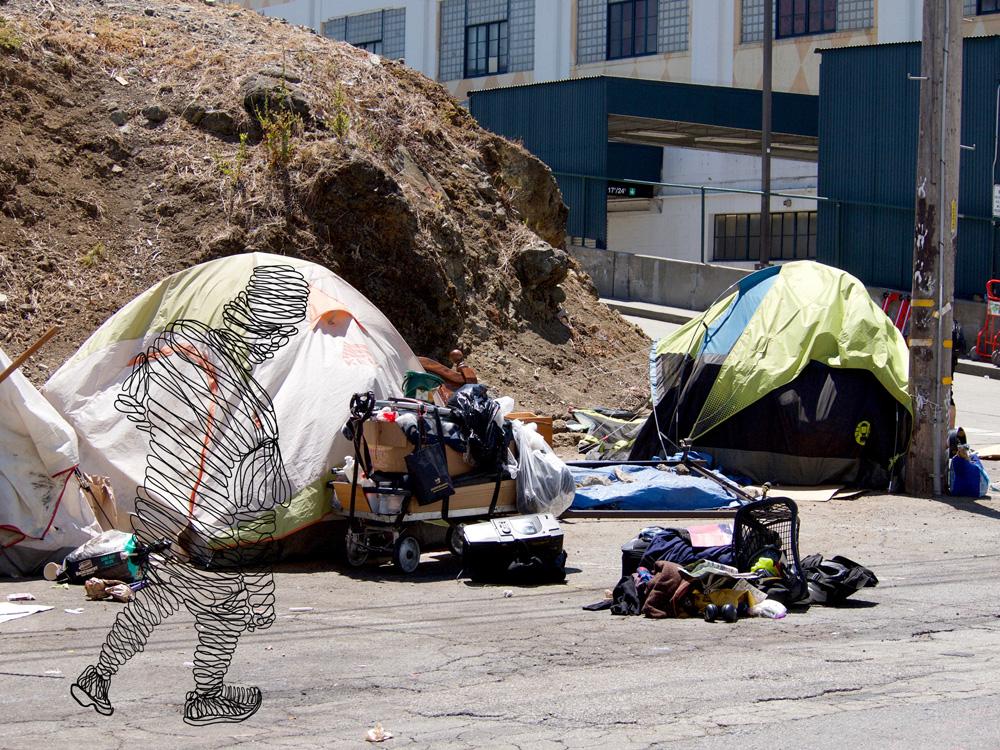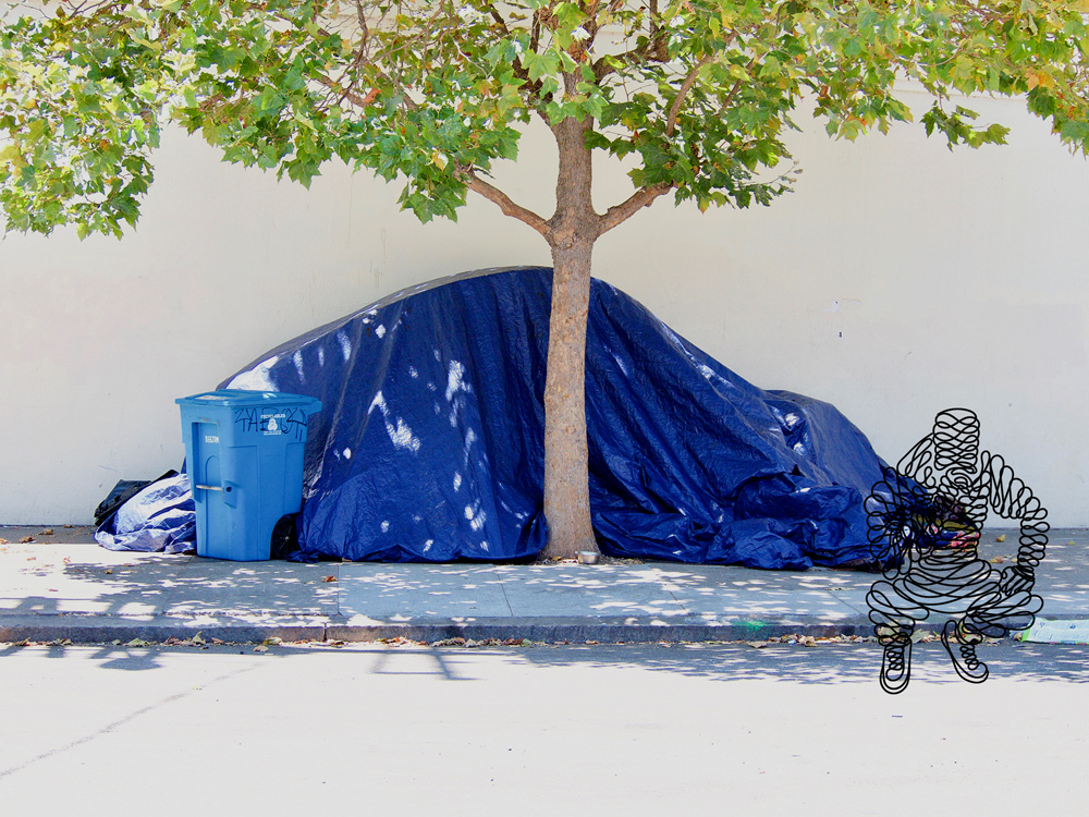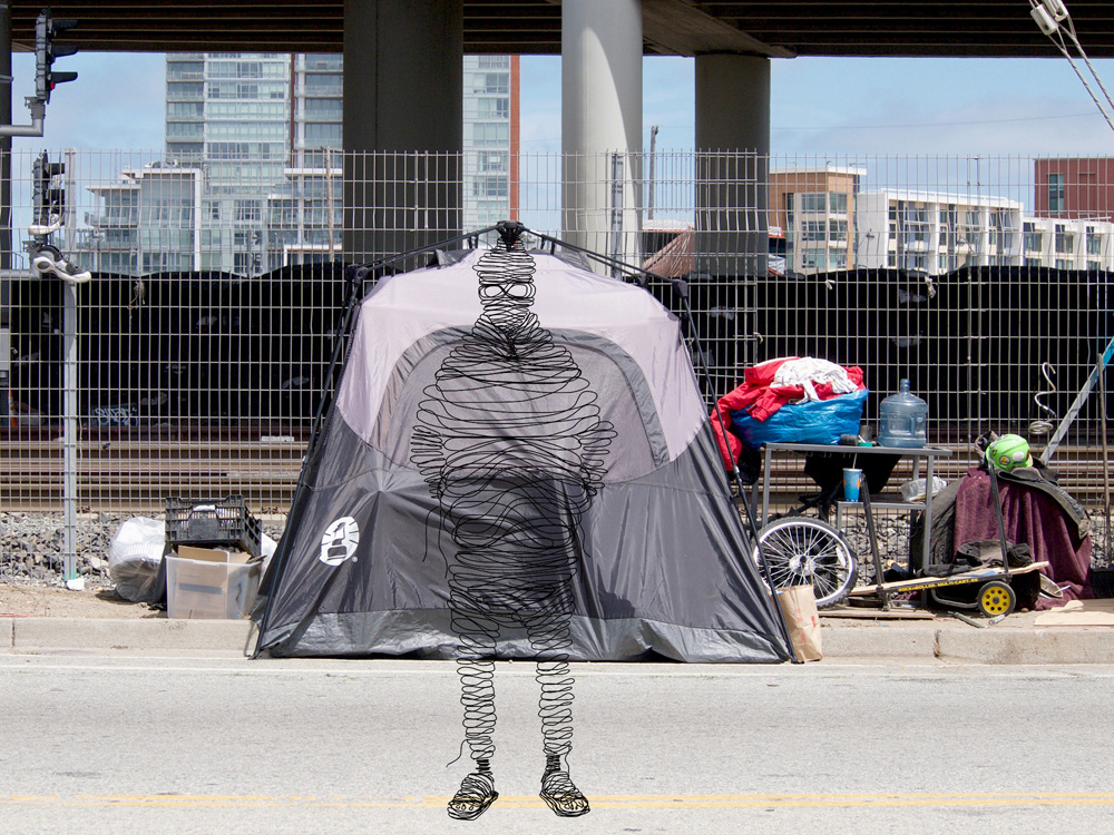 “Tent City, San Francisco” is a collage of 50 tents photographed to document this alternative living in San Francisco. This was part of a “Housing” exhibit I curated with 17 other artists for the office of Senator Scott Wiener in the California State Building. The piece measures 30″ X 80″ and includes drawings from my “Linemen” series to represent this estranged population.