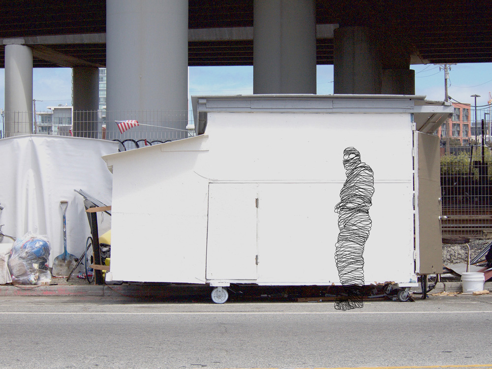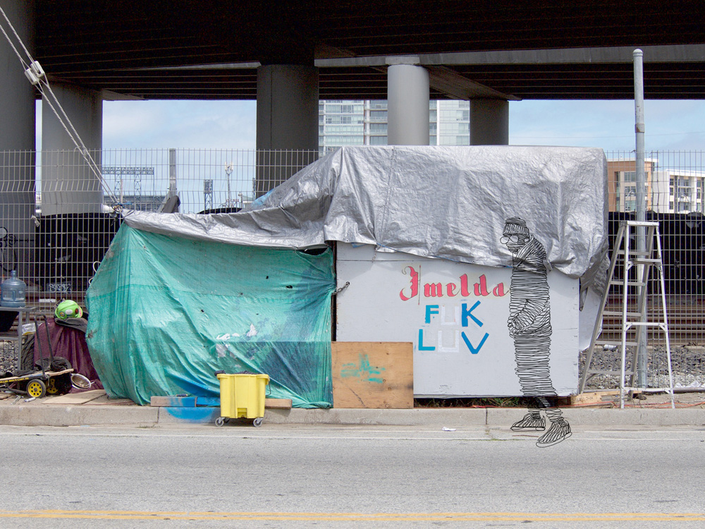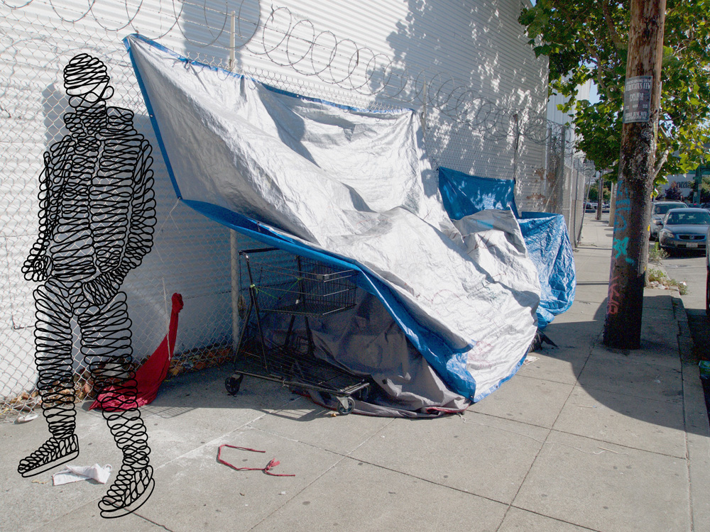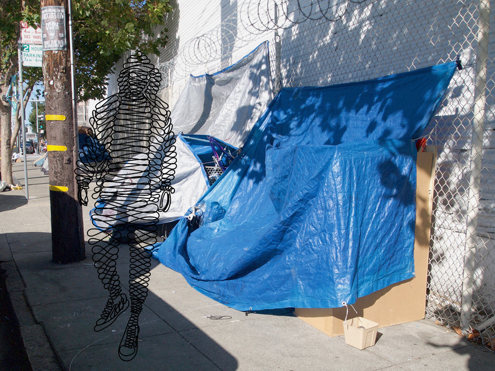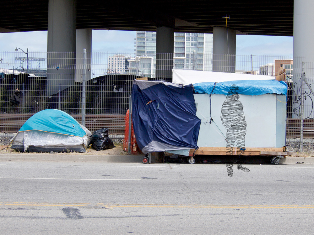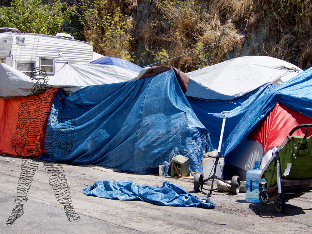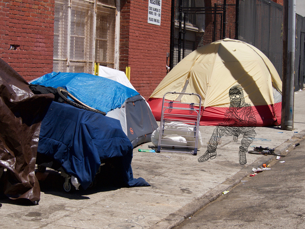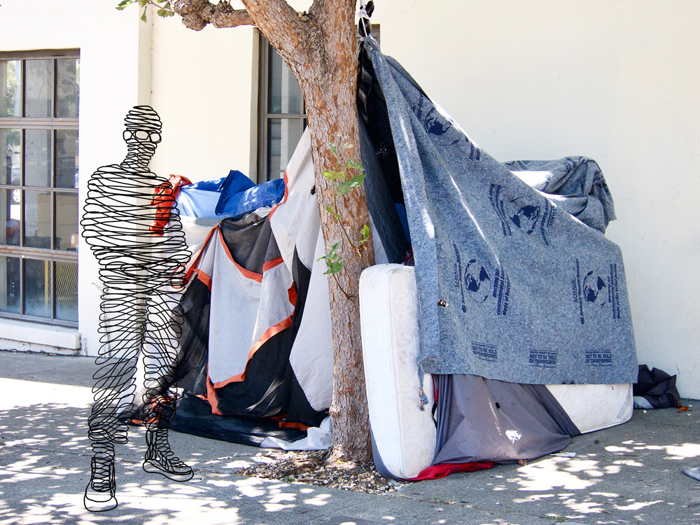“Tent City, San Francisco” is a collage of 50 tents photographed to document this alternative living in San Francisco. This was part of a “Housing” exhibit I curated with 17 other artists for the office of Senator Scott Wiener in the California State Building. The piece measures 30″ X 80″ and includes drawings from my “Linemen” series to represent this estranged population.