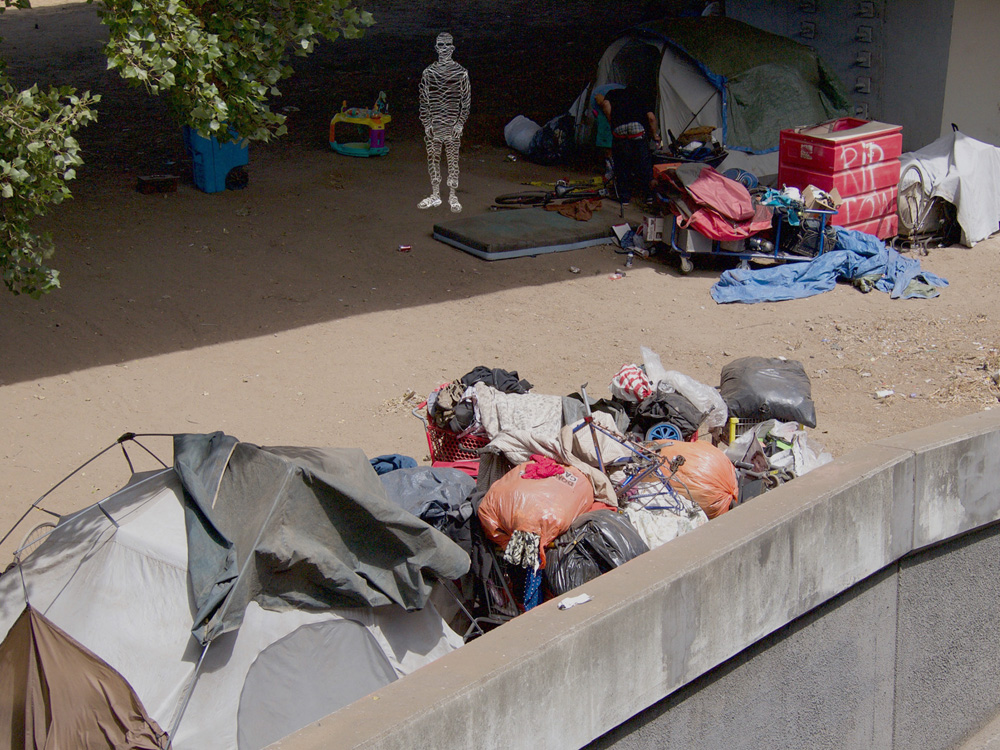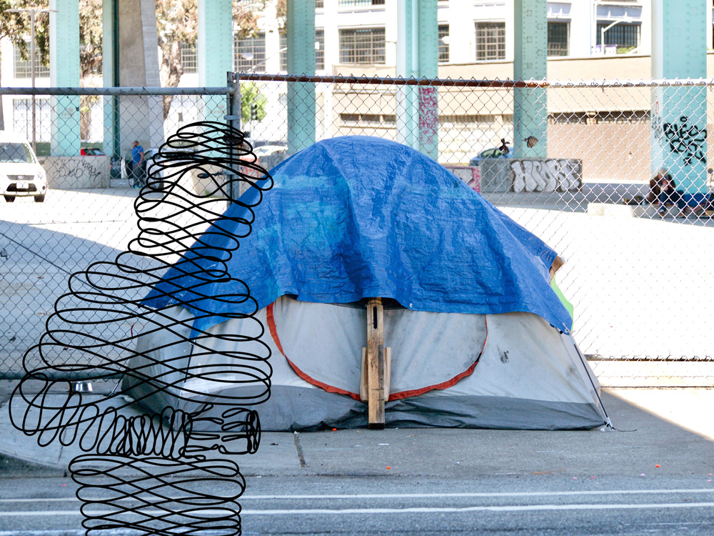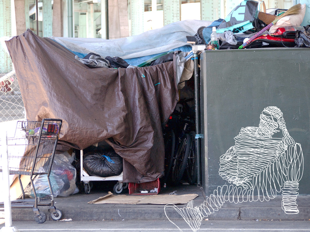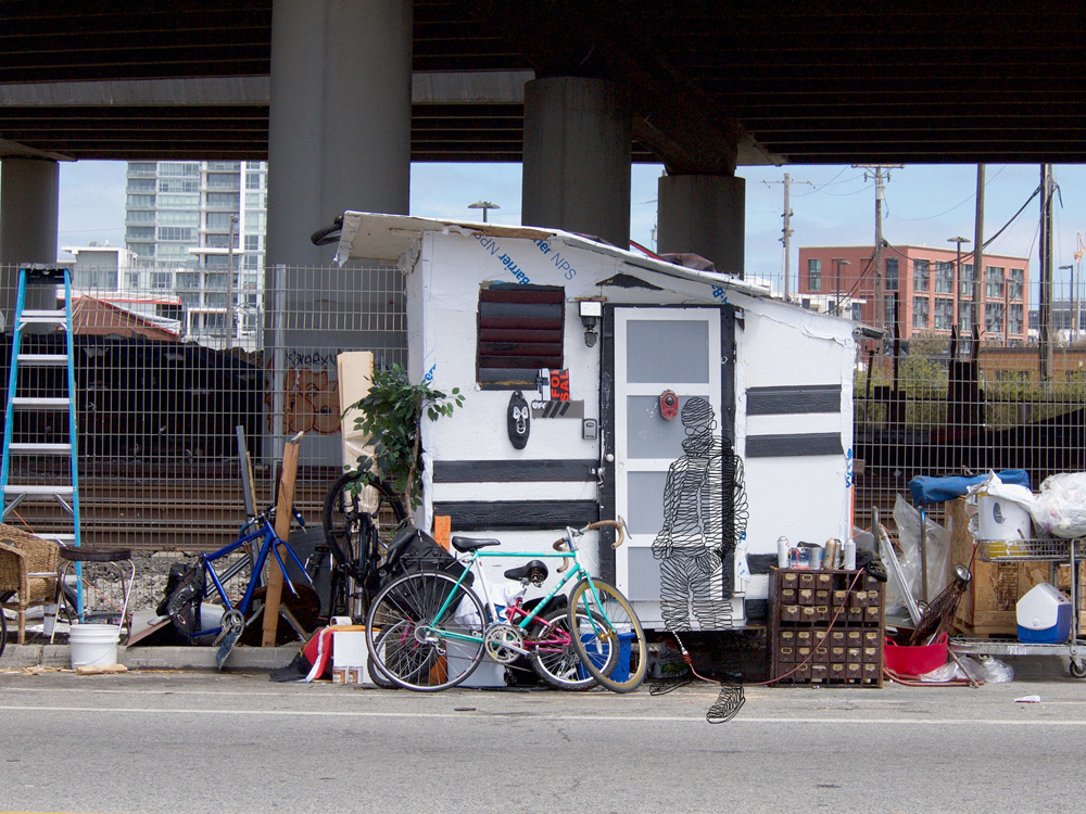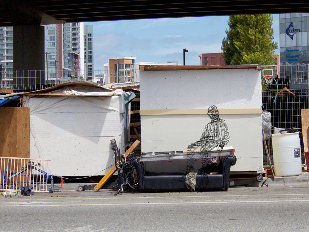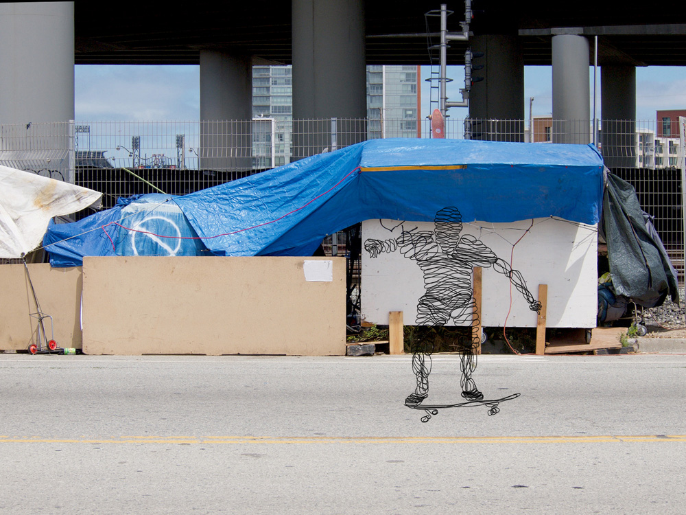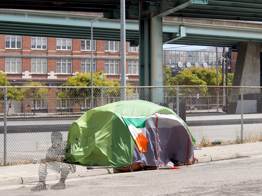 “Tent City, San Francisco” is a collage of 50 tents photographed to document this alternative living in San Francisco. This was part of a “Housing” exhibit I curated with 17 other artists for the office of Senator Scott Wiener in the California State Building. The piece measures 30″ X 80″ and includes drawings from my “Linemen” series to represent this estranged population.