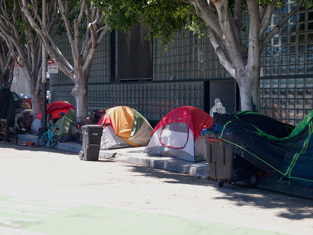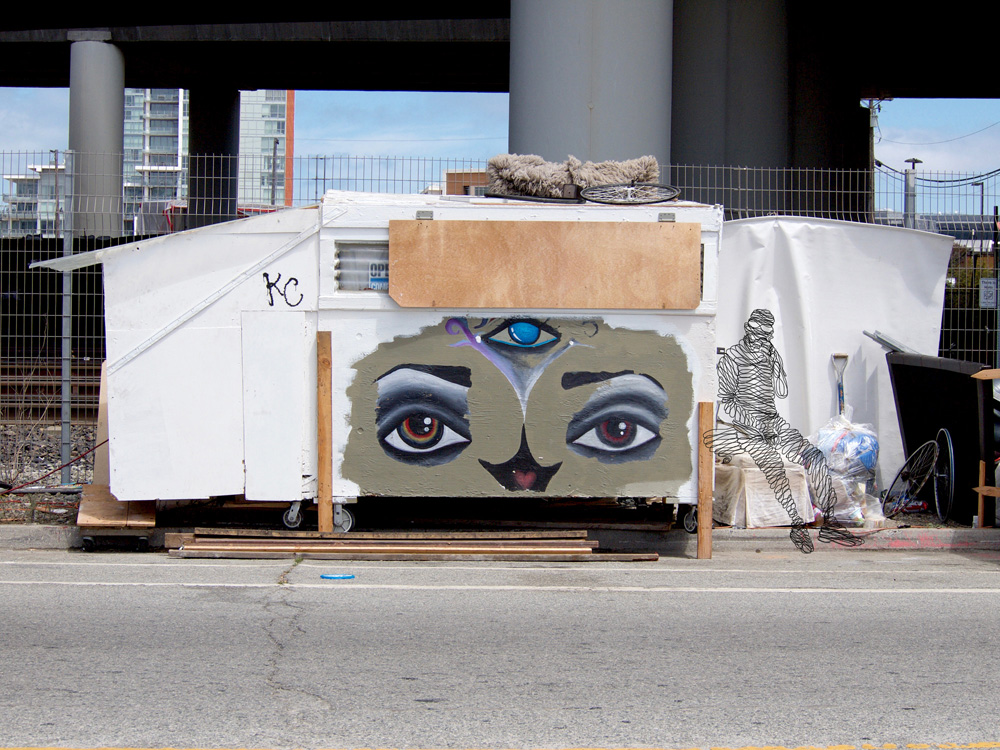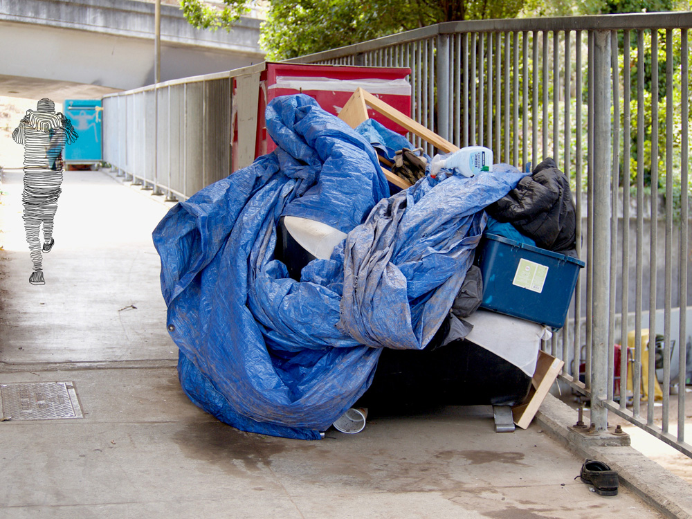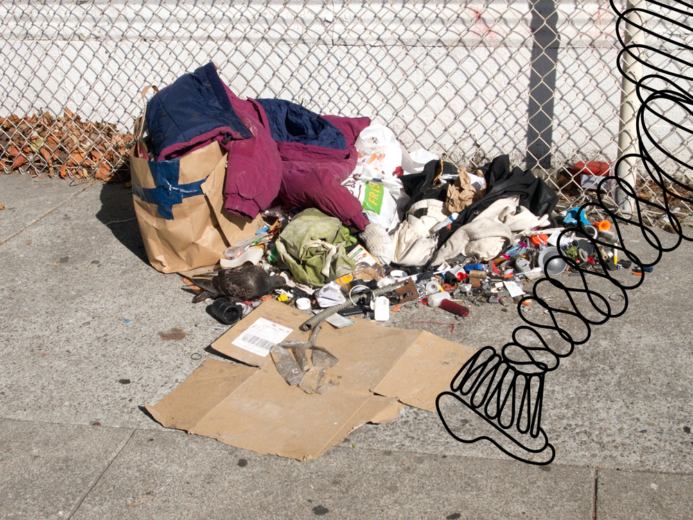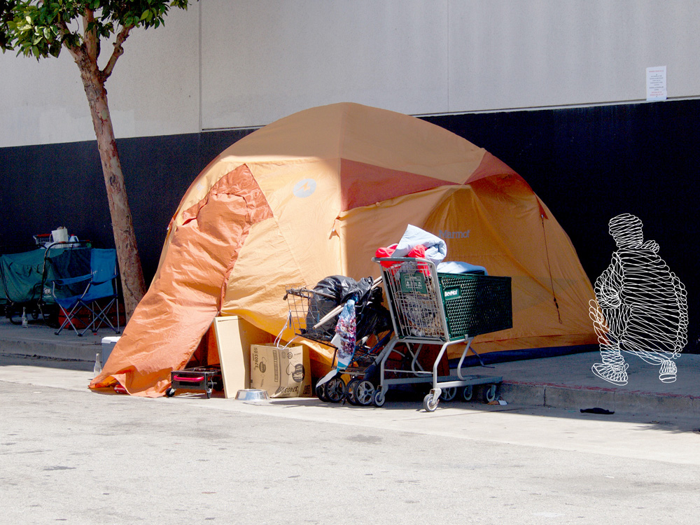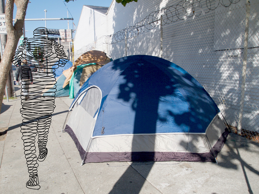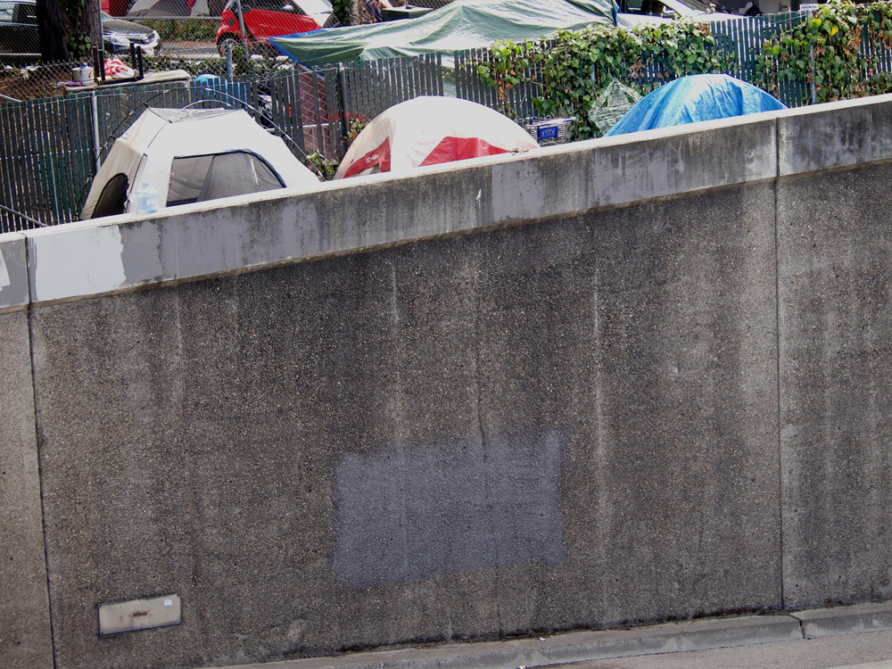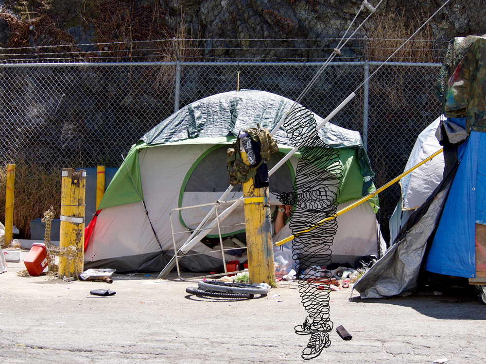 “Tent City, San Francisco” is a collage of 50 tents photographed to document this alternative living in San Francisco. This was part of a “Housing” exhibit I curated with 17 other artists for the office of Senator Scott Wiener in the California State Building. The piece measures 30″ X 80″ and includes drawings from my “Linemen” series to represent this estranged population.